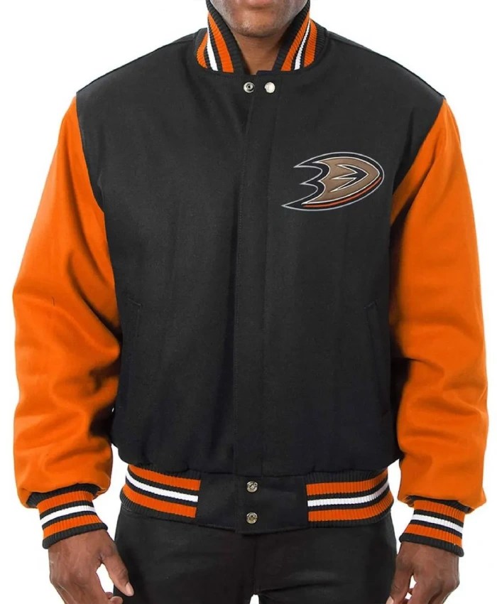 Buy Now Anaheim Ducks Black and Orange Varsity Jacket For Unisex