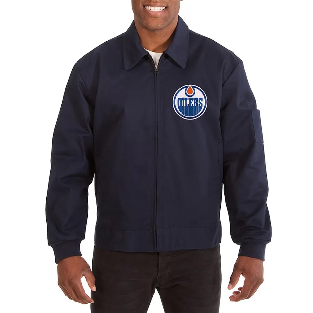 Buy Now Edmonton Oilers Workwear Navy Cotton Bomber Jacket For Unisex