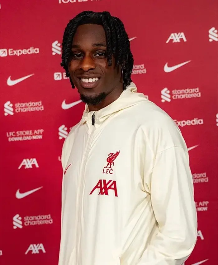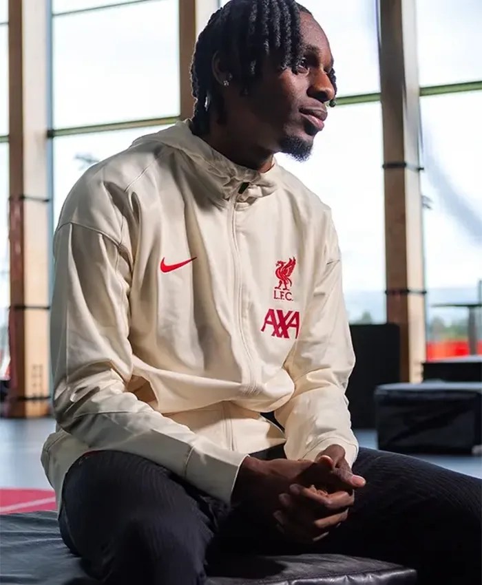 Buy Now Jeremie Frimpong Nike Liverpool FC Strike Cream Track Bomber Jacket For Unisex.