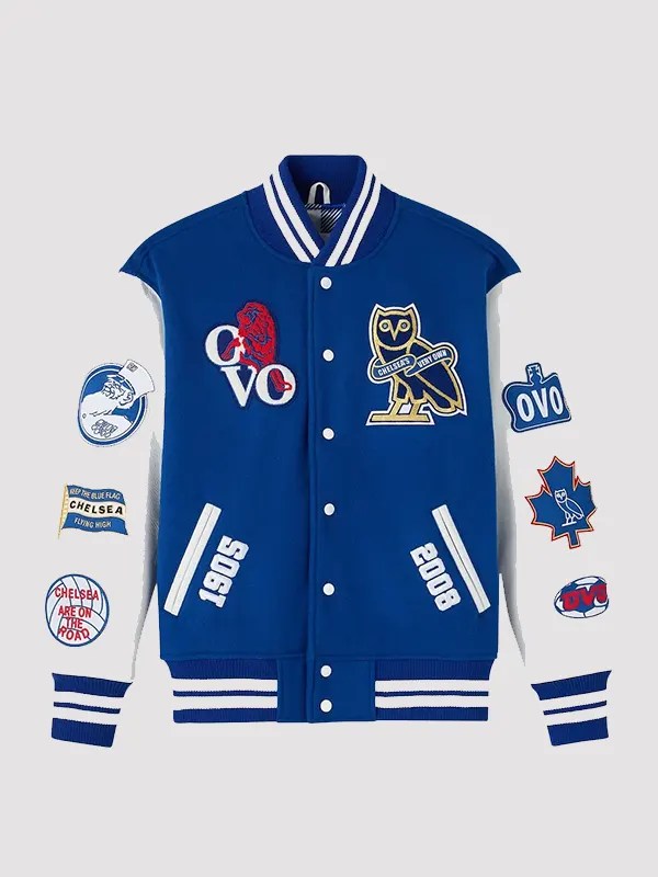 Buy Now OVO x Chelsea FC Royal Blue And White Varsity Jacket For Unisex